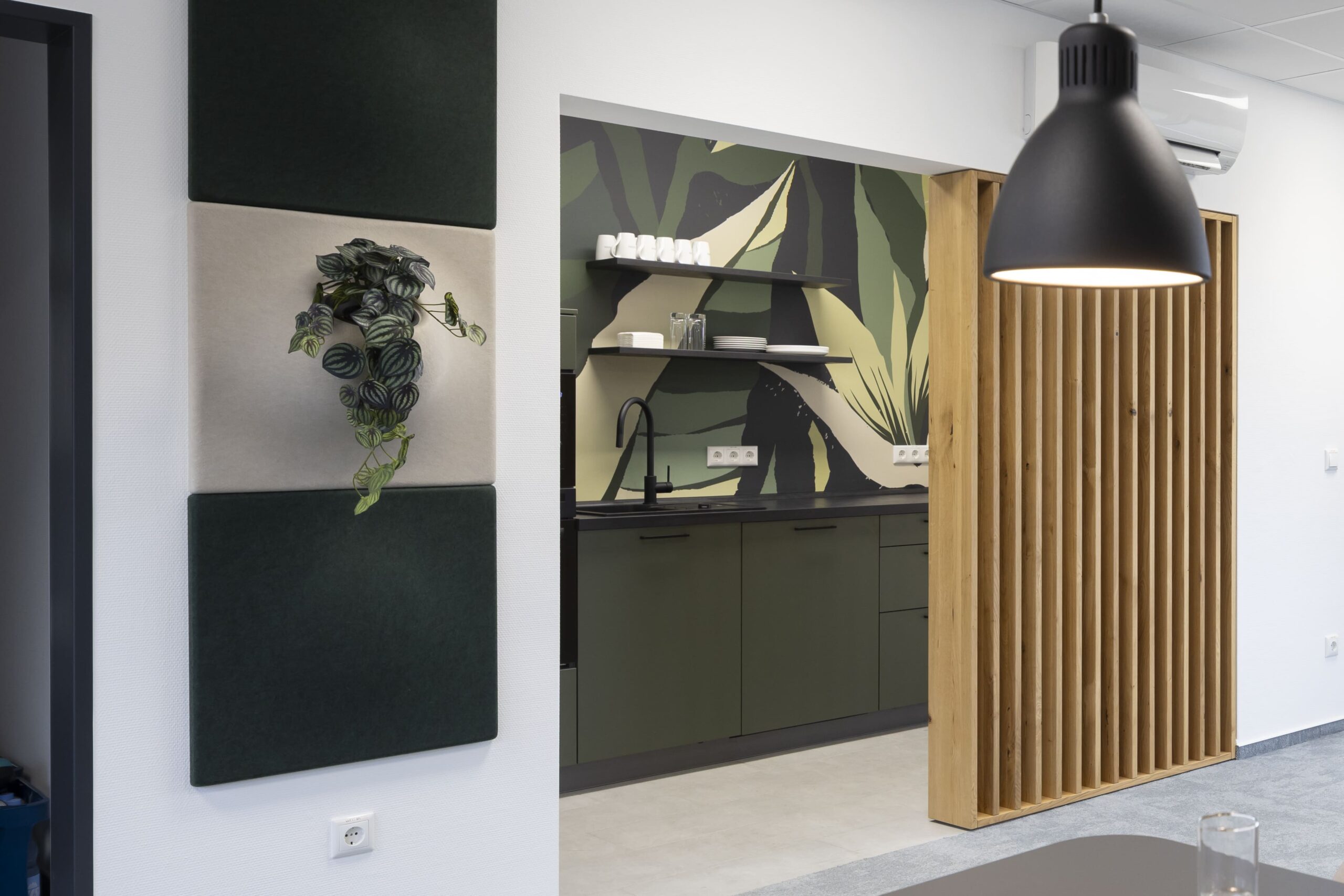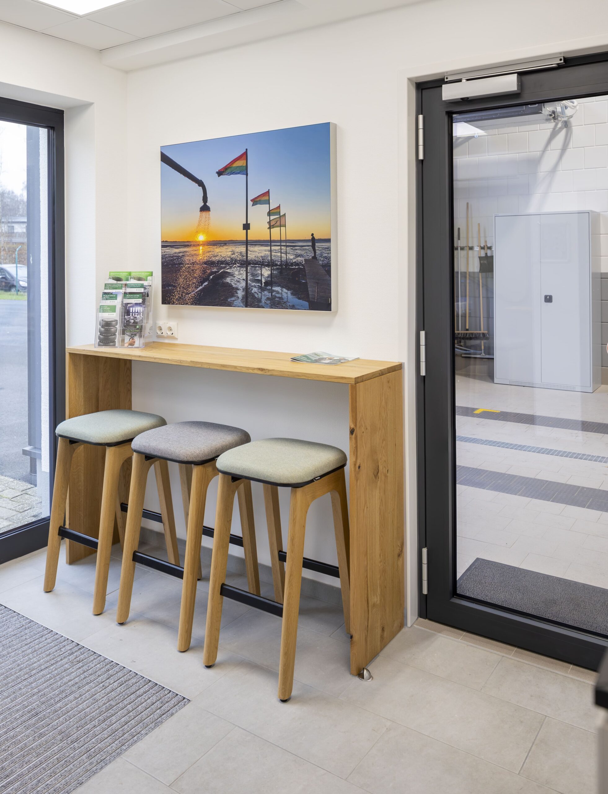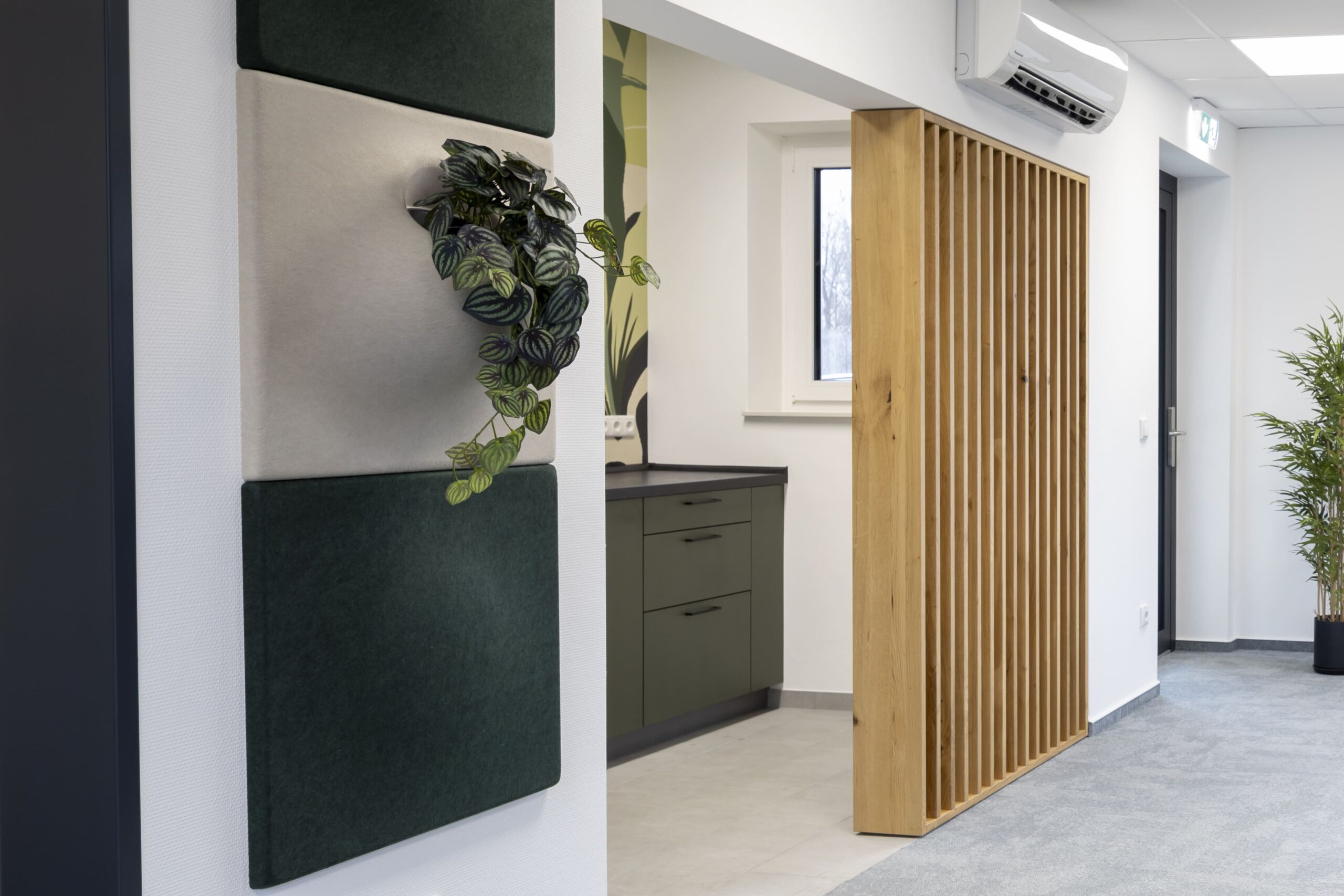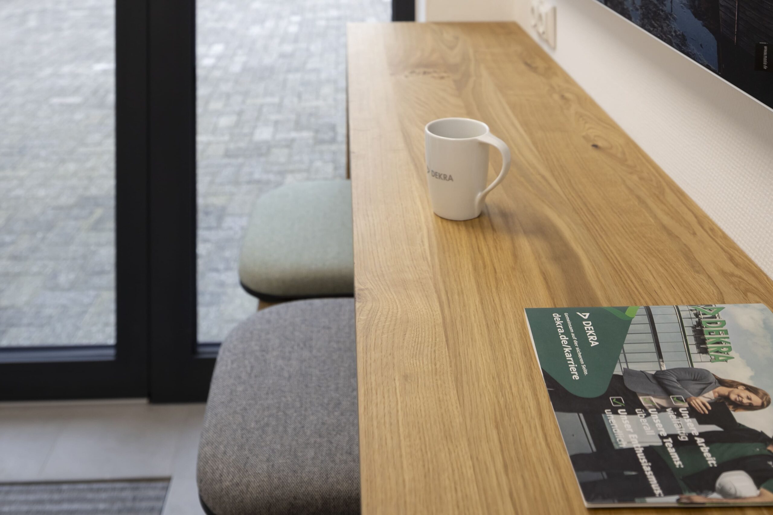 Ein besonderes gestalterisches Highlight stellt die Mitarbeiterküche in den grünen CI-Farben von DEKRA dar. Ergänzt wurde sie durch eine individuell abgestimmte Wandgestaltung, die Identität schafft und den Raum sichtbar aufwertet. Darüber hinaus lag ein besonderer Fokus auf maßgefertigten Sonderelementen und Tischlerarbeiten, darunter handgearbeitete Holzlamellen sowie Kommunikationsbereiche mit Holzboards im Wartebereich. Diese Elemente verleihen dem Gebäude eine warme, hochwertige Anmutung und fördern den Austausch.