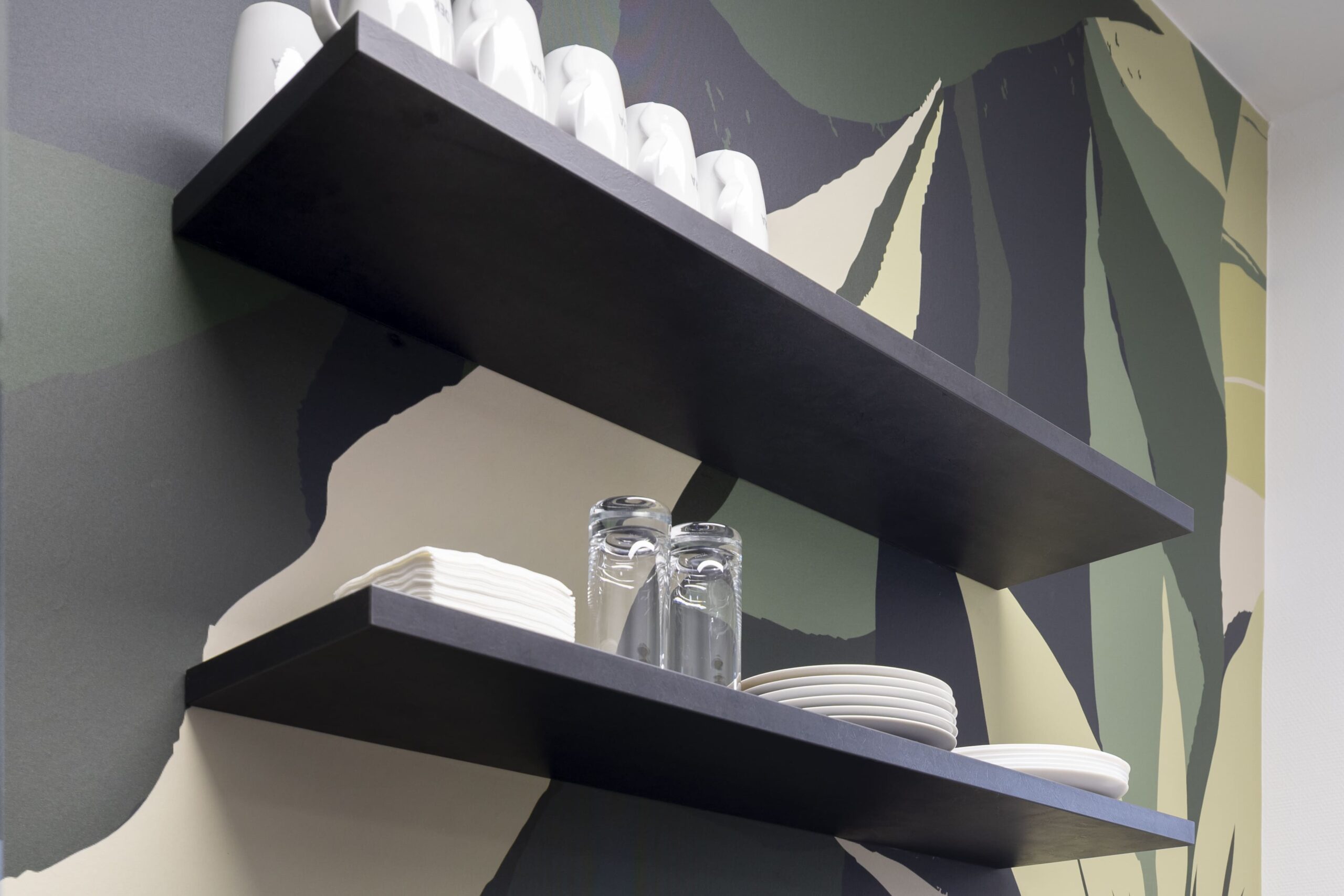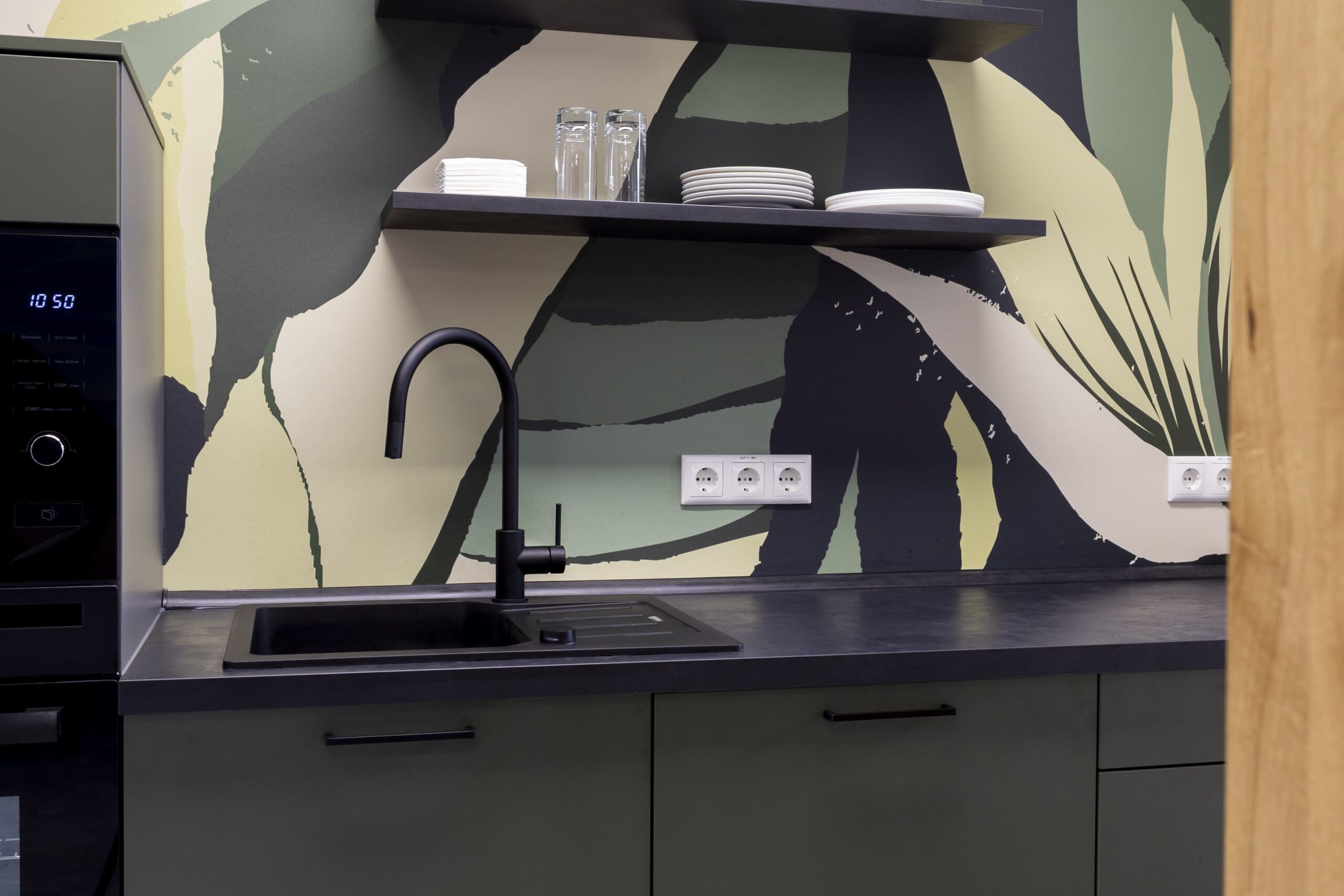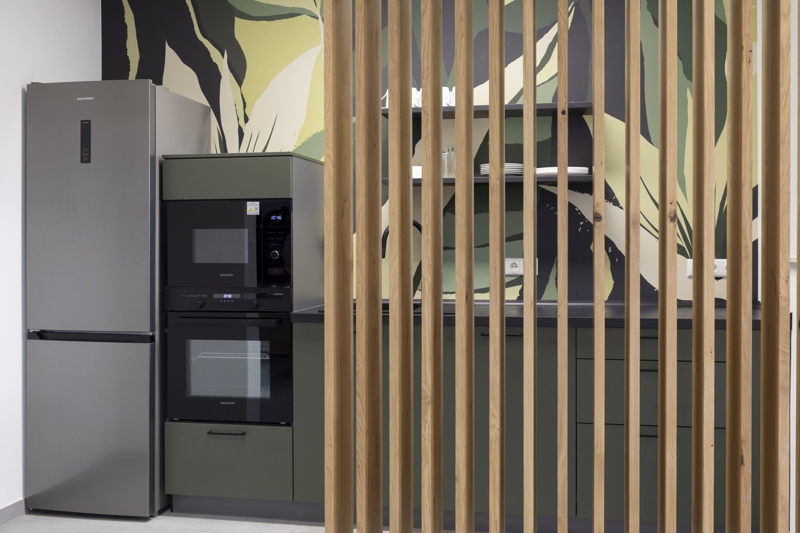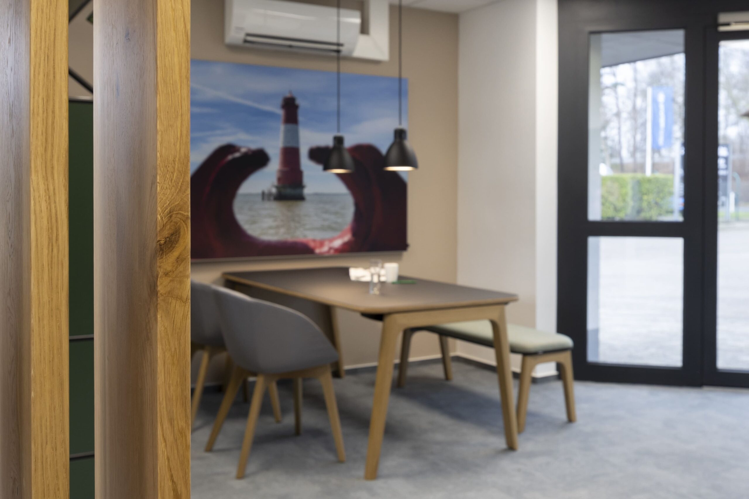 Ein besonderes gestalterisches Highlight stellt die Mitarbeiterküche in den grünen CI-Farben von DEKRA dar. Ergänzt wurde sie durch eine individuell abgestimmte Wandgestaltung, die Identität schafft und den Raum sichtbar aufwertet. Darüber hinaus lag ein besonderer Fokus auf maßgefertigten Sonderelementen und Tischlerarbeiten, darunter handgearbeitete Holzlamellen sowie Kommunikationsbereiche mit Holzboards im Wartebereich. Diese Elemente verleihen dem Gebäude eine warme, hochwertige Anmutung und fördern den Austausch.